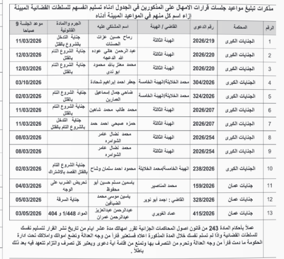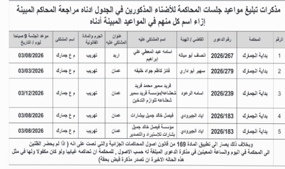 أخبار اليوم - صدرت اليوم الاثنين، مذكرات تبليغ بمواعيد جلسات المحاكمة لمشتكى عليهم في المحاكم النظامية.وأكدت المذكرات، ان عدم حضور المشتكى عليهم يعرضهم لاحتمال إصدار امر بالقبض عليهم ولو كانوا مكفولين.وتاليا الأسماء والمواعيد: