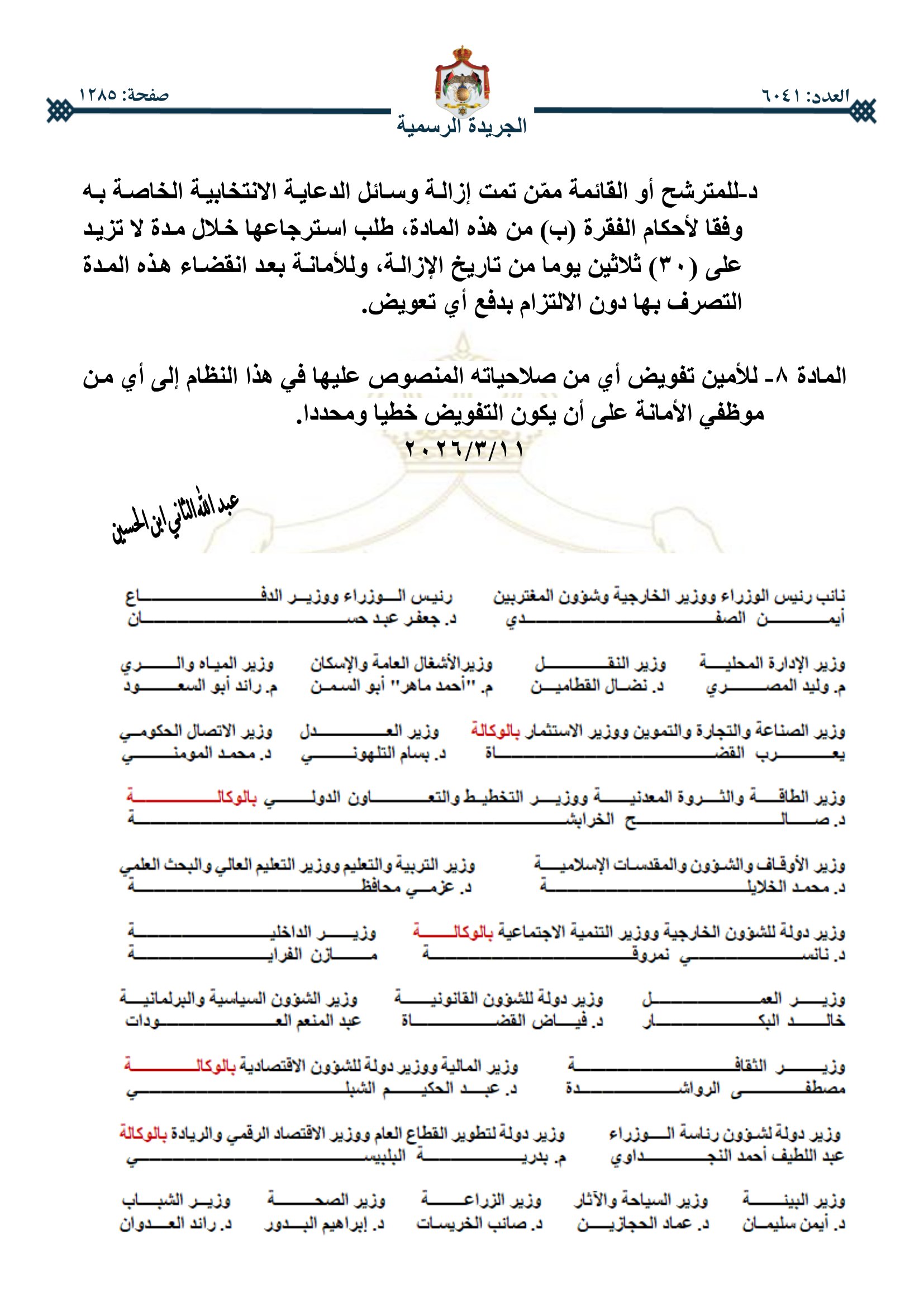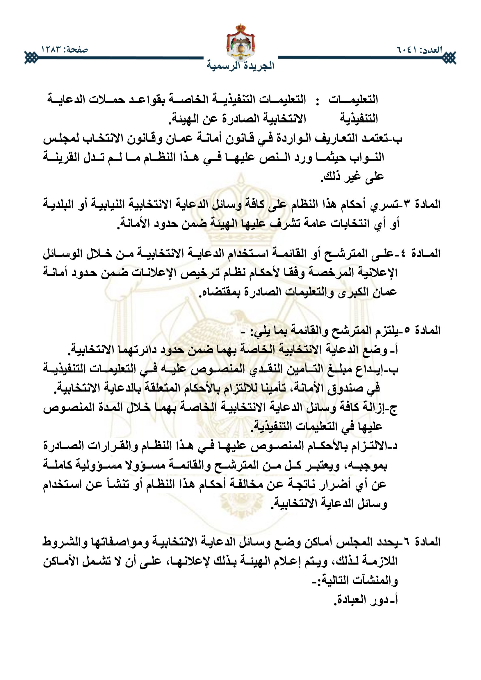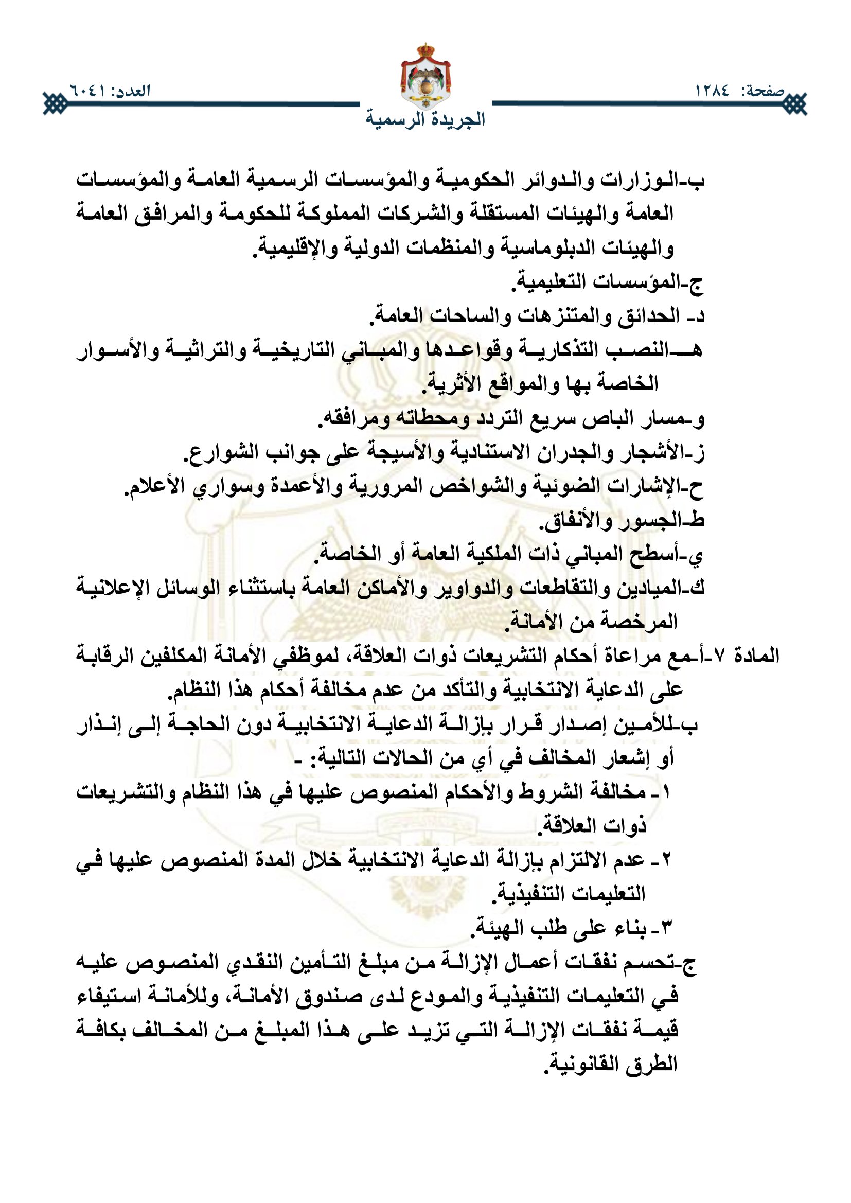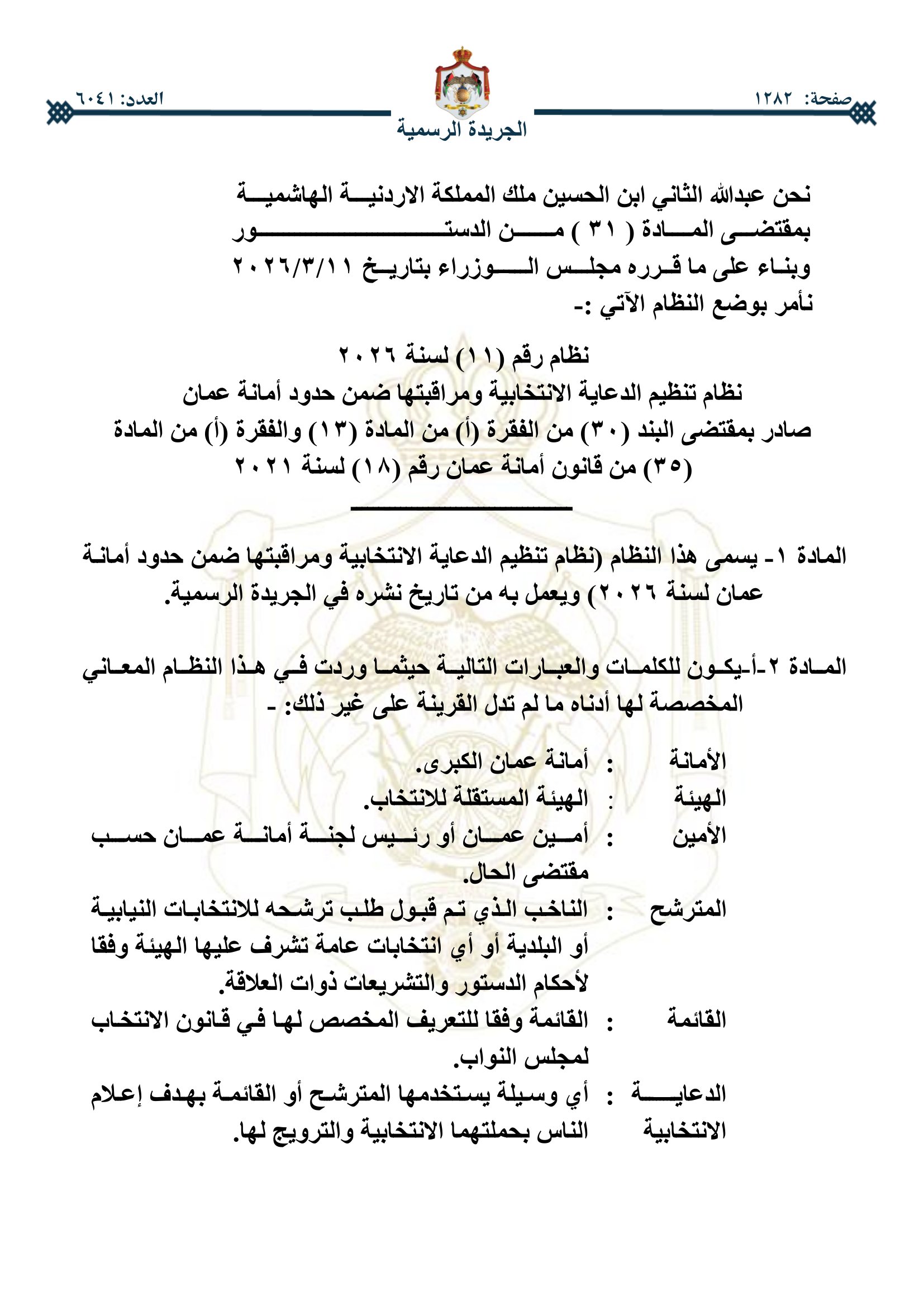 أخبار اليوم - صدر في عدد الجريدة الرسمية اليوم الخميس، نظام تنظيم الدعاية الانتخابية ومراقبتها ضمن حدود أمانة عمان.