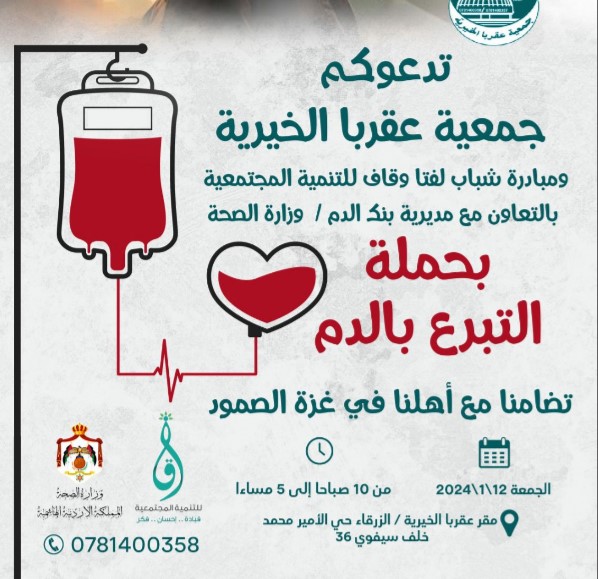 كما أعلنت الجمعية، أن الهدف من الحملة هو جمع 1000 وحدة دم، وذلك يوم الجمعة 12/1/2024 من الساعة 10 صباحا إلى 5 مساء، في مقر جمعية عقربا في الزرقاء.