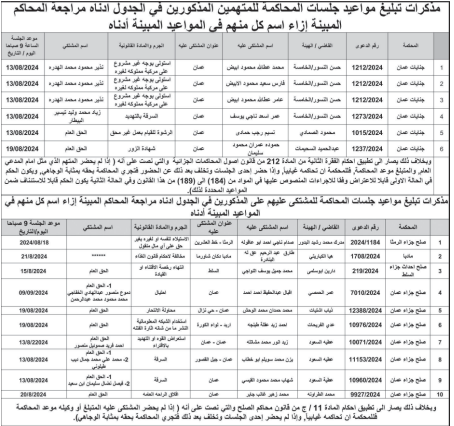 أخبار اليوم - صدرت مذكرات تبليغ اليوم الاثنين، مذكرات تبليغ مواعيد جلسات المحاكمة لمشتكى عليهم ولمتهمين ولأظناء وقرارات إمهال.وطلبت المذكرات من المذكورين في الجداول أدناه مراجعة المحاكم المبينة إزاء اسم كل منهم في المواعيد المبينة أدناه.وتاليا الأسماء ومواعيد الجلسات:
