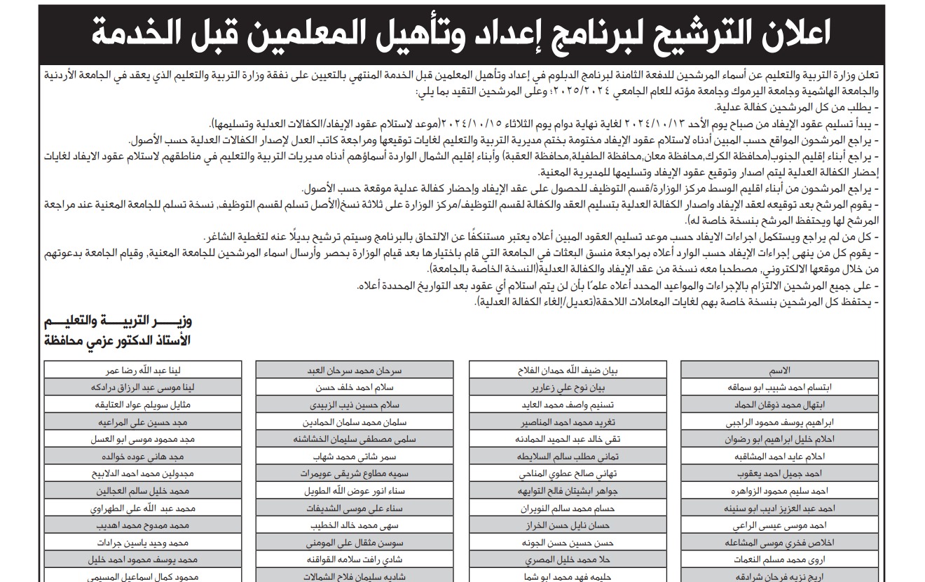 أخبار اليوم - أعلنت وزارة التربية والتعليم، الأحد، عن أسماء المرشحين للدفعة الثامنة لبرنامج الدبلوم في إعداد وتأهيل المعلمين قبل الخدمة المنتهي بالتعيين على نفقة وزارة التربية والتعليم الذي يعقد في الجامعة الأردنية والجامعة الهاشمية وجامعة اليرموك وجامعة مؤتة للعام الجامعي 2024 - 2025.