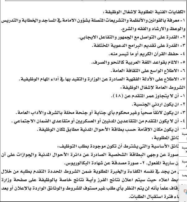 أخبار اليوم - أعلنت وزارة الأوقاف والشؤون والمقدسات الإسلامية عن حاجتها لتعيين ائمة مساجد من حملة بكالوريوس تخصص الشريعة، براتب شهري إجمالي قدره 500 دينار.