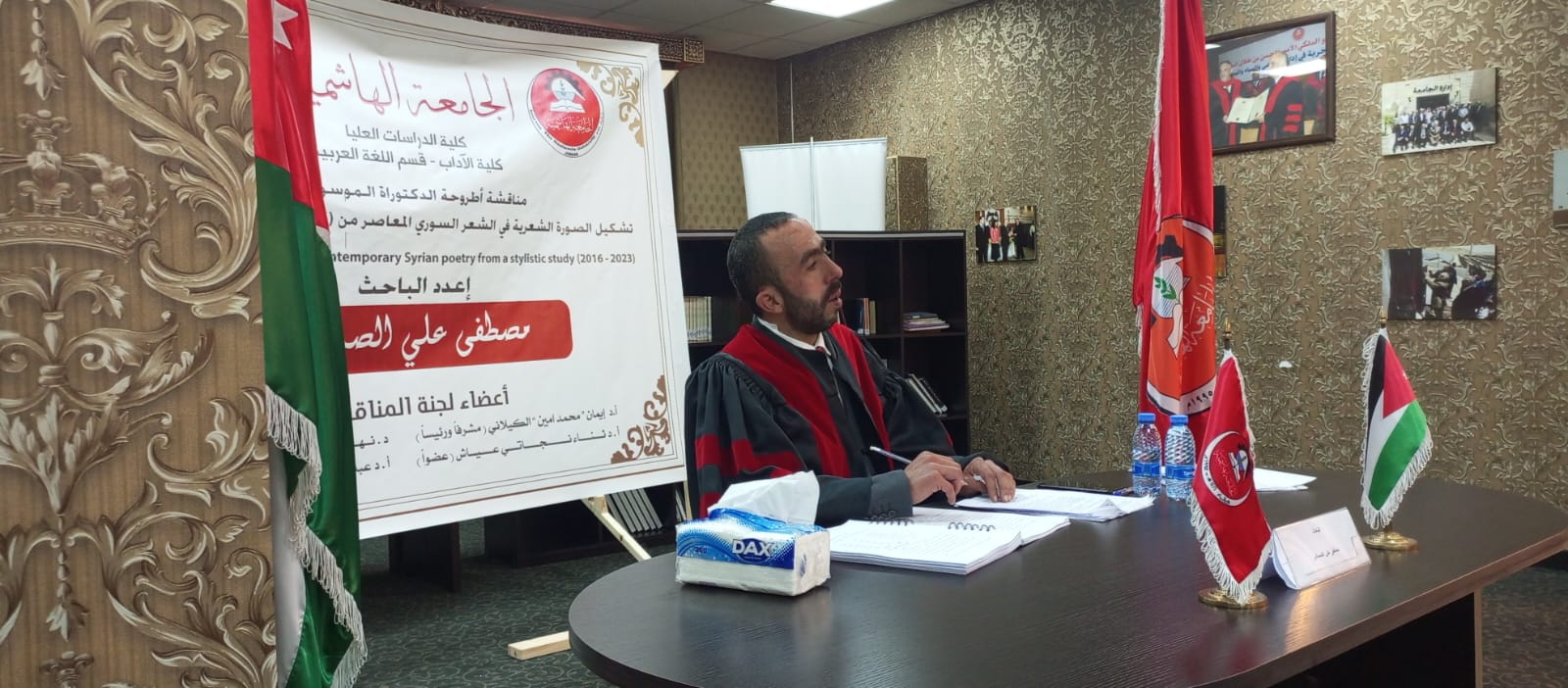 أخبار اليوم - عشيرة آل الصمادي في بلدة خشيبة، تهنئ الدكتور مصطفى علي الصمادي، بمناسبة حصوله على درجة الدكتوراة في الأدب العربي من الجامعة الهاشمية، بعد أن ناقش أطروحته الموسومة بـ "تشكيل الصورة الشعرية في الشعر السوري المعاصر من 2016 - 2023"، اليوم الخميس الموافق 2025/1/9.