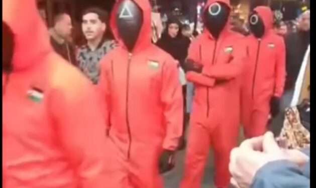 وظهر الشخص الأول وهو يرتدي قناع «الزومبي» الأسود على وجهه ويحمل سلاحا رشاشا «غير حقيقي»، بينما كان البقية يرتدون ملابس وأغطية حمراء خلف الشخص الأول.