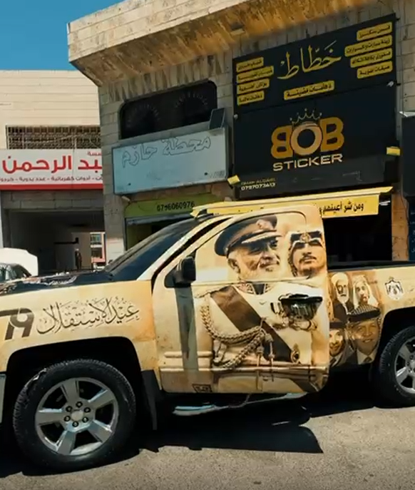 ومن بين أبرز مظاهر الاحتفال اللافتة، كانت مبادرة المبدع عمر القيسي، الذي قدّم لمسة فنية فريدة من نوعها، حيث قام بتزيين عدد من السيارات بصور رمزية من التراث والهوية الأردنية، ما حولها إلى لوحات متنقلة تنبض بحب الوطن.